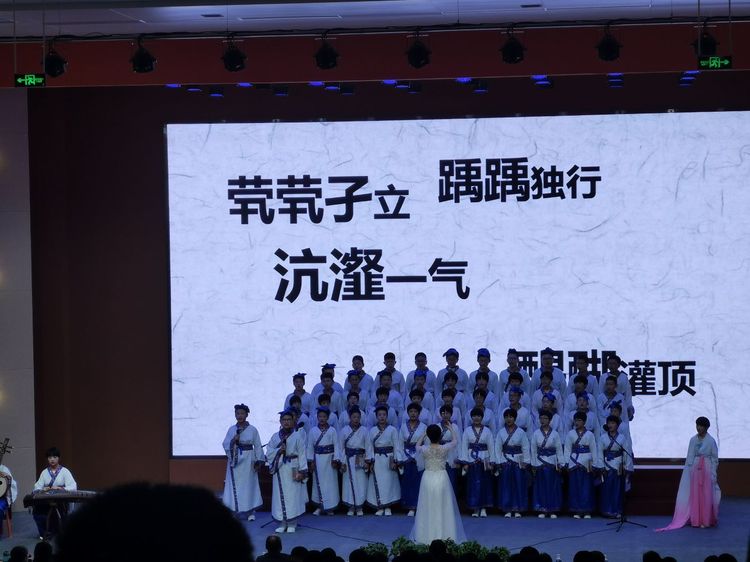 恍惚間,我們已穿越千年,與文人墨客探討漢字的魅力。七(3)班帶來合唱曲目《陋室銘》《生僻字》。