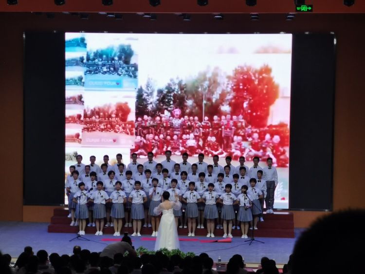 我歌唱每一條河流,歌唱每一座高山,歌唱我最親愛的祖國。歐陽一寒老師、劉紅艷老師、七年級教師合唱隊、飛翔之夢合唱團共同演繹《我和我的祖國》。