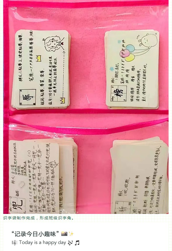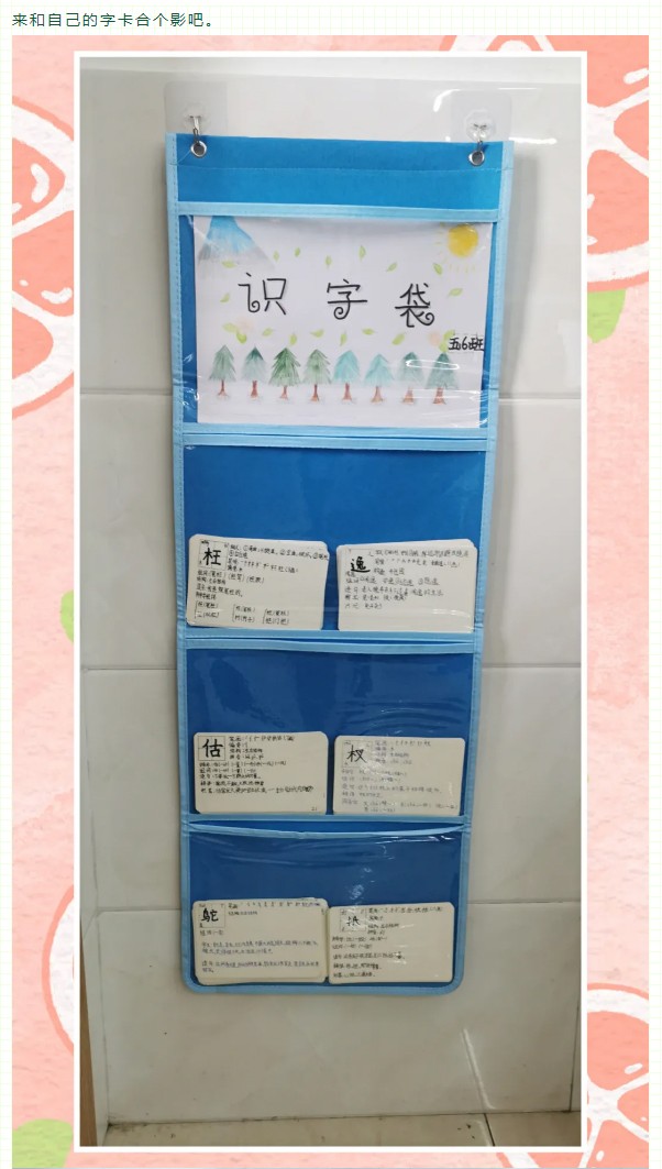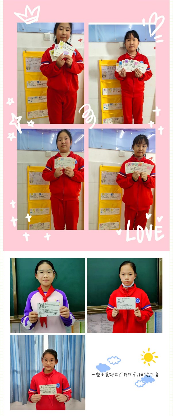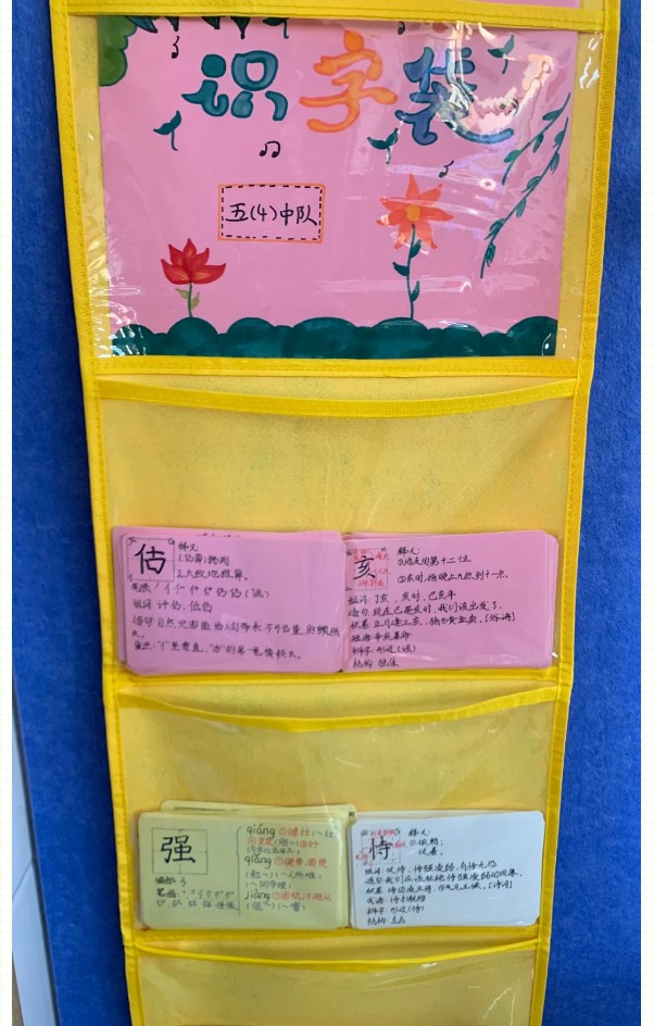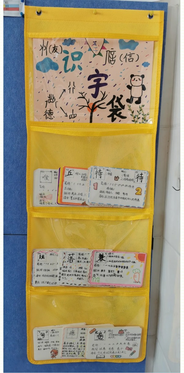 識字是學習文化的起點,是閱讀寫作的基礎。識字的多少、快慢直接關系到學生的閱讀能力和寫作能力的強弱。小學生只有具有一定的識字量才能比較順利地進行閱讀和寫作,拓展知識面,提高學習的能力。為積極落實國家“雙減”政策,提高學生的識字能力,我校五年級學生自制了識字卡和識字袋,形成了班級的識字角,在閑暇之余進行自主識字。