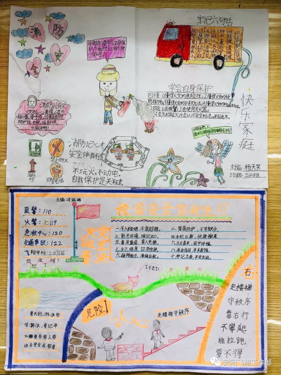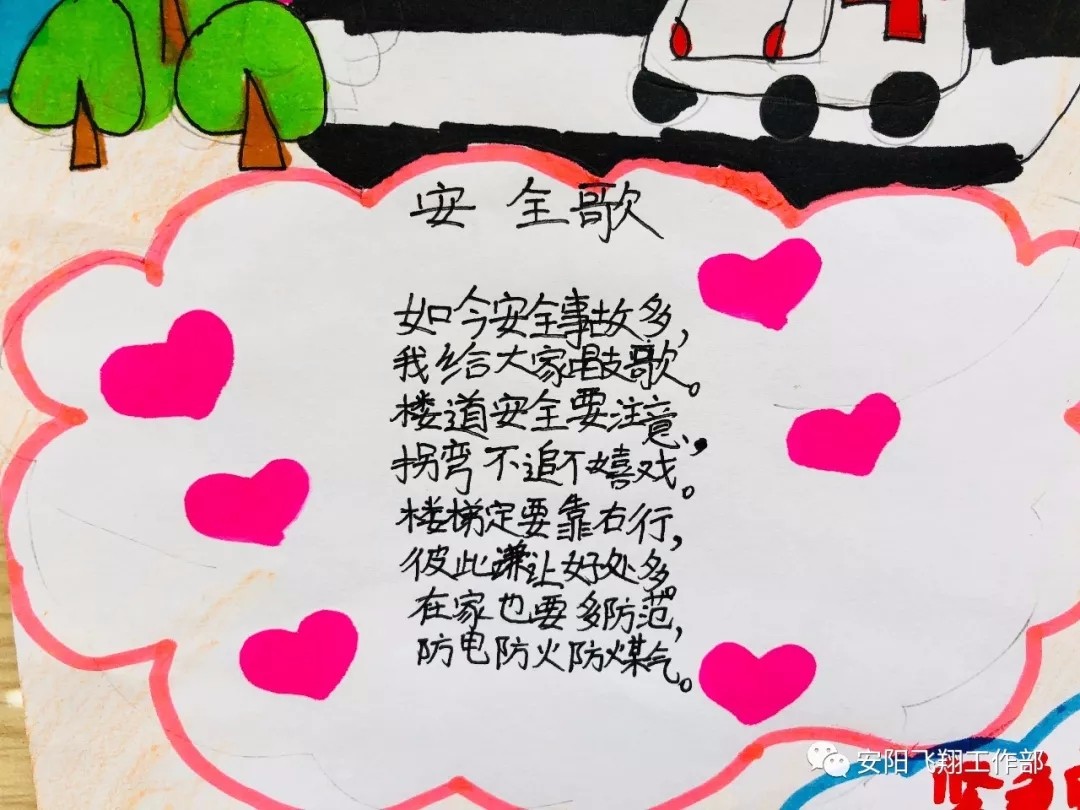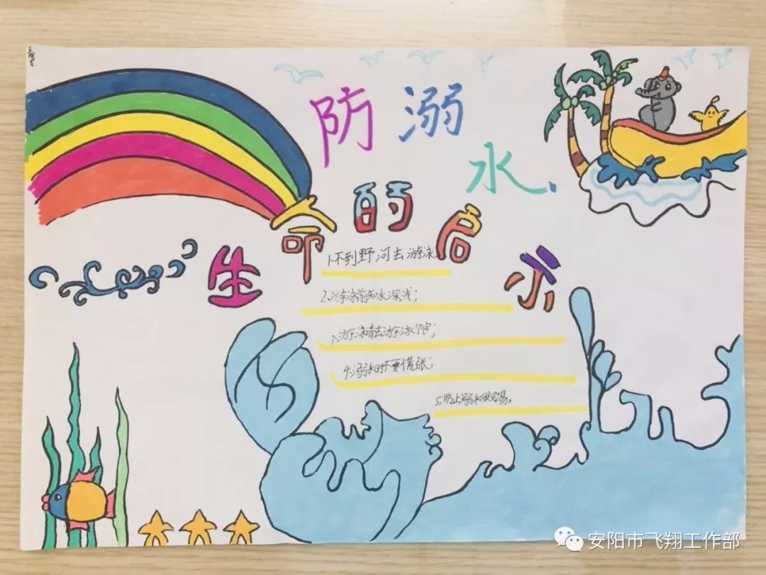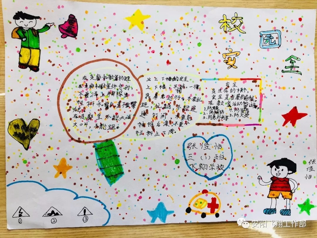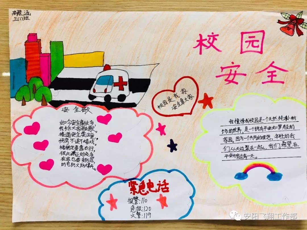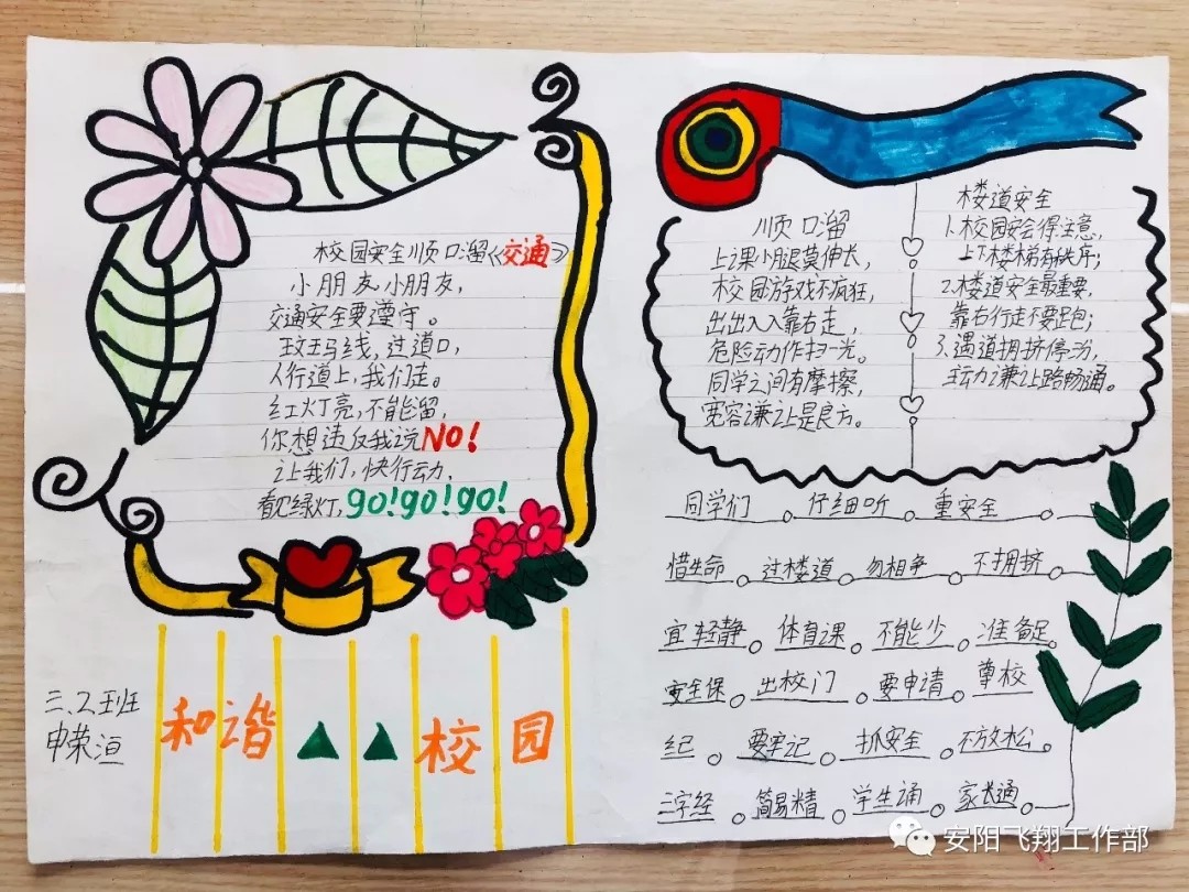 “生命高于一切,安全重于泰山”為了進(jìn)一步增強(qiáng)學(xué)生的安全意識,保障學(xué)生的安全與健康,飛翔學(xué)校開展了“創(chuàng)建平安校園”系列主題教育活動。各班除了開展“安全健康教育”主題班會外,學(xué)生們還用手中的畫筆將校園安全知識、防溺水知識、衛(wèi)生健康知識等內(nèi)容生動形象、或?qū)懟虍嫷卣故驹趯懤L紙上,同時(shí)也將安全牢記心間。