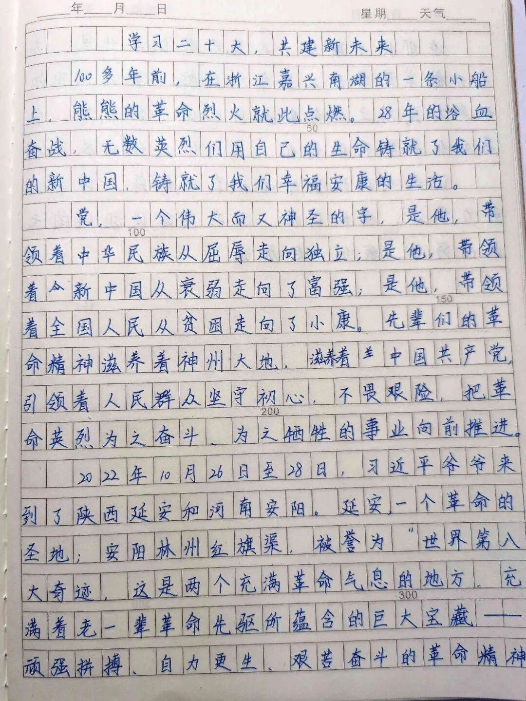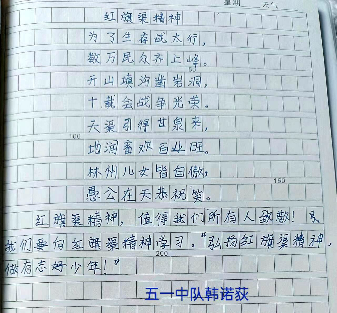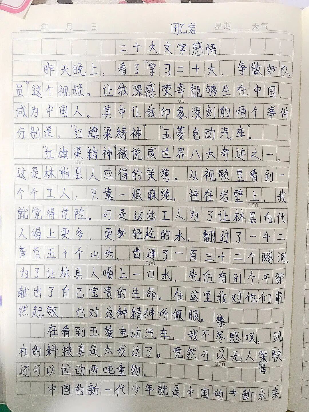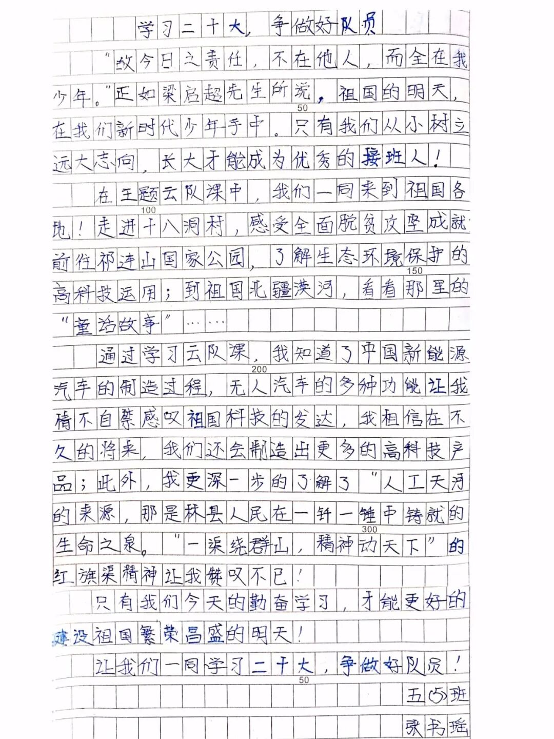 學(xué)習(xí)二十大 爭(zhēng)做好隊(duì)員 安陽(yáng)市飛翔學(xué)校大隊(duì)部 為面向廣大少先隊(duì)員宣傳黨的二十大精神,講好新時(shí)代十年的偉大變革,共同暢想中國(guó)式現(xiàn)代化的美好圖景,教育引導(dǎo)廣大少先隊(duì)員努力成長(zhǎng)為堪當(dāng)民族復(fù)興重任的時(shí)代新人,12月17日晚,安陽(yáng)市飛翔學(xué)校小學(xué)部全體隊(duì)員齊聚云端,共同收看由共青團(tuán)中央、全國(guó)少工委舉行的“學(xué)習(xí)二十大,爭(zhēng)做好隊(duì)員”主題云隊(duì)課直播活動(dòng)。 云端同學(xué)習(xí) 砥礪共奮進(jìn) 在主題云隊(duì)課直播中,隊(duì)員們欣賞了祖國(guó)各地的壯麗河山,感受了全面脫貧攻堅(jiān)的偉大成就,前往祁連山國(guó)家公園,了解了祖國(guó)北疆漠河生態(tài)環(huán)境保護(hù)的高科技應(yīng)用,那里的“童話故事”振奮人心!翱翔藍(lán)天的“戰(zhàn)鷹”又給隊(duì)員們的科技?jí)粝氩迳狭蓑v飛的翅膀...... 隊(duì)員們?cè)趯W(xué)習(xí)黨的二十大精神中汲取成長(zhǎng)的力量,明確前進(jìn)的方向。藍(lán)圖已經(jīng)繪就,號(hào)角已經(jīng)吹響,讓我們不忘初心,遠(yuǎn)眺未來(lái),在星星火炬的指引下,在黨的陽(yáng)光照耀下,緊跟著黨奮進(jìn)充滿夢(mèng)想與光榮的新遠(yuǎn)征! 致敬新時(shí)代 薪火永傳承 沐浴黨的陽(yáng)光,迎接鮮艷飄揚(yáng)的紅旗。觀看結(jié)束后,隊(duì)員們深受啟發(fā),把學(xué)習(xí)成果轉(zhuǎn)化為實(shí)際行動(dòng),用自己的方式表達(dá)弘揚(yáng)紅旗渠精神和爭(zhēng)做新時(shí)代好隊(duì)員的決心。 隊(duì)員們紛紛表示現(xiàn)在正是“恰同學(xué)少年,風(fēng)華正茂”,作為當(dāng)代的少先隊(duì)員要弘揚(yáng)、傳承并踐行自力更生、艱苦奮斗、不怕困難等偉大的民族精神,并從小立志高遠(yuǎn),好好學(xué)習(xí)科學(xué)文化知識(shí),努力成長(zhǎng),為創(chuàng)造祖國(guó)輝煌未來(lái)貢獻(xiàn)自己的力量。 眼有星辰大海,心有繁花似錦。黨的二十大已掀開(kāi)新的時(shí)代篇章,光榮的少先隊(duì)員生逢盛世、奮斗其時(shí),當(dāng)踔厲奮發(fā)、勇毅前行。我們要牢記習(xí)爺爺?shù)膰谕校脤?shí)際行動(dòng)傳承紅色基因,不忘初心,刻苦學(xué)習(xí),沿著革命先輩的光榮歷程,用實(shí)際行動(dòng)詮釋錚錚誓言,堅(jiān)定聽(tīng)黨話,永遠(yuǎn)跟黨走,努力成長(zhǎng)為能夠擔(dān)當(dāng)民族復(fù)興大任的時(shí)代新人。 -END- 圖/文:王顯 審 校:王俐入